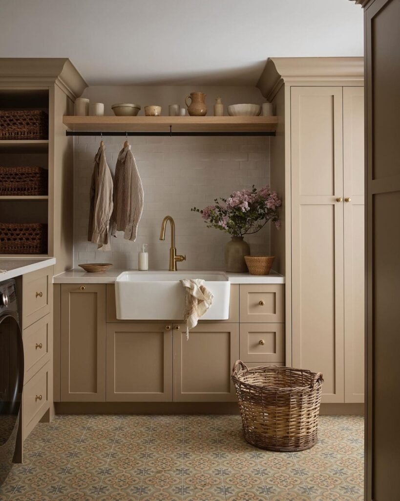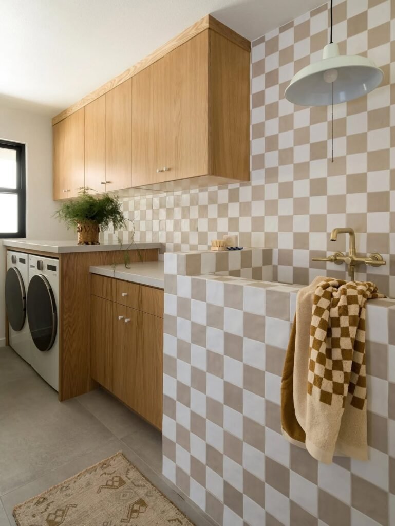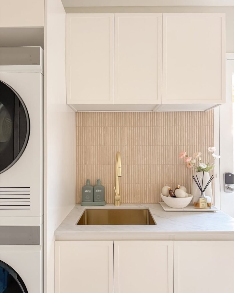 Depth i isn’t just about color — it’s built through texture, and tile does that effortlessly. The variety of finishes, tones, and shapes makes it easy to create a space that feels layered and personal rather than flat. On top of its visual impact, tiles are also incredibly practical: durable, water-resistant, easy to clean, and budget-friendly. It’s no surprise it remains a go-to choice for laundry rooms that aim to feel both refined and livable.