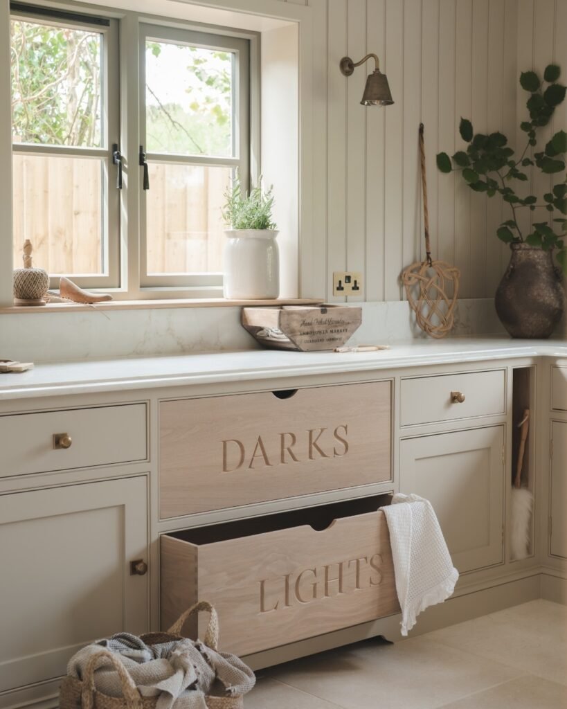 Light-colored wood instantly brightens a laundry room, making it feel airy, open, and welcoming. Visually, it adds warmth and a natural, organic touch without overwhelming the space, and its reflective quality helps small rooms feel larger. Paired with neutral walls or soft textiles, light wood creates a fresh, clean, and timeless look that makes laundry feel less like a chore and more like a calm, inviting space.