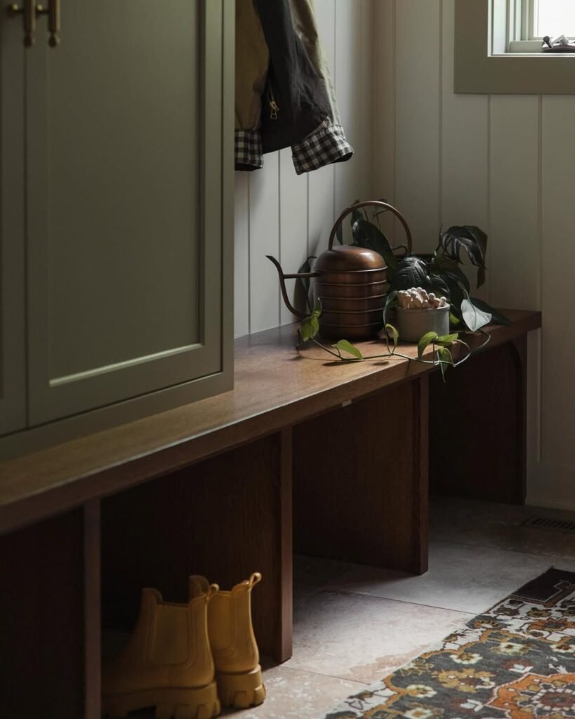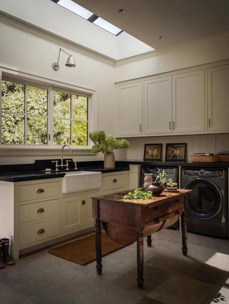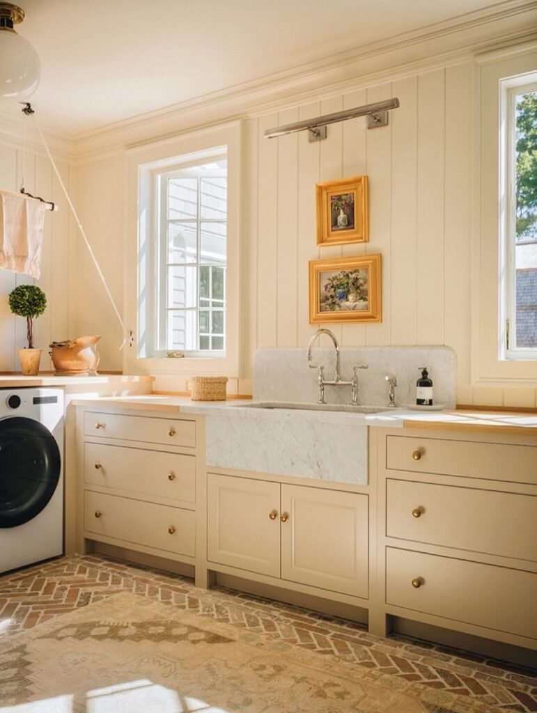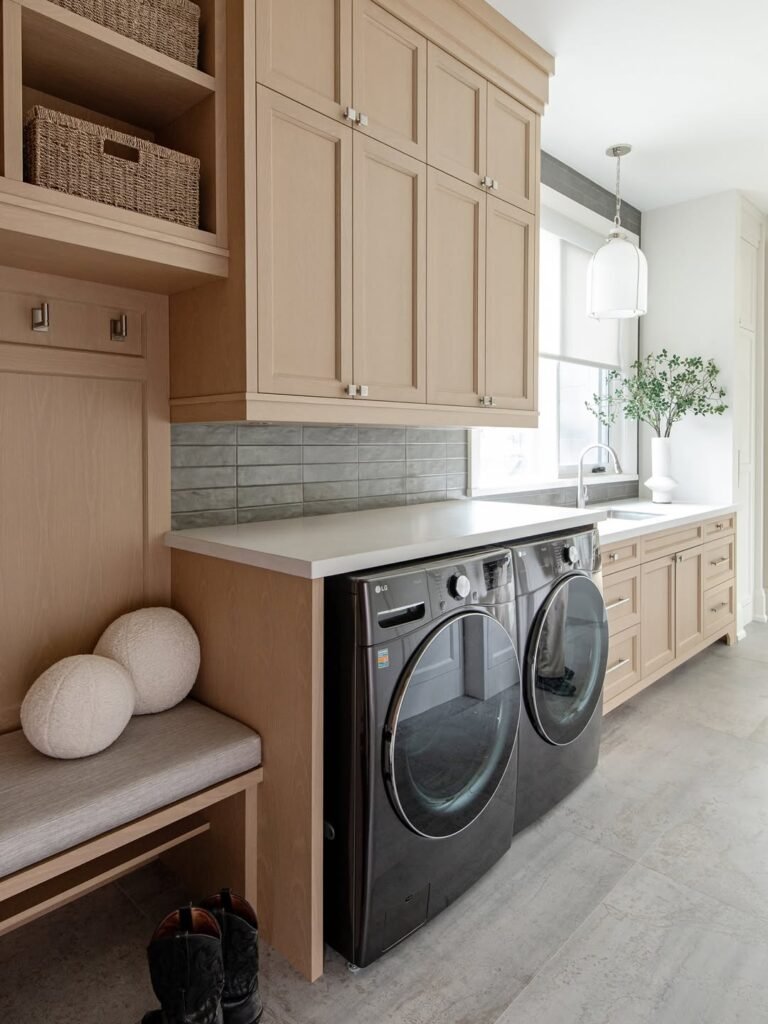 A seating area in a laundry room makes perfect sense because it turns a purely functional space into a more comfortable, practical spot. A small bench or chair gives you a place to fold clothes, sort laundry, or take a quick break while waiting for a load to finish. It also adds warmth and personality, making the room feel inviting rather than just a utilitarian chore zone.
