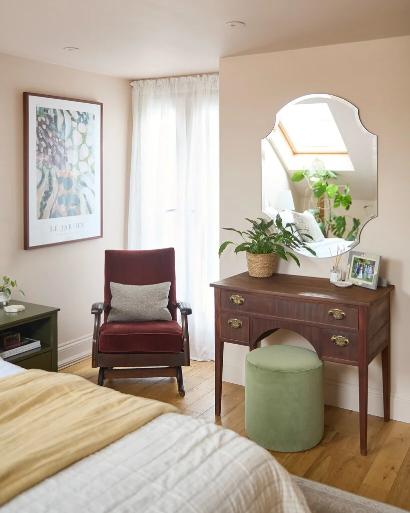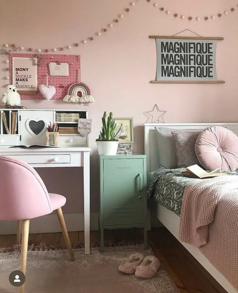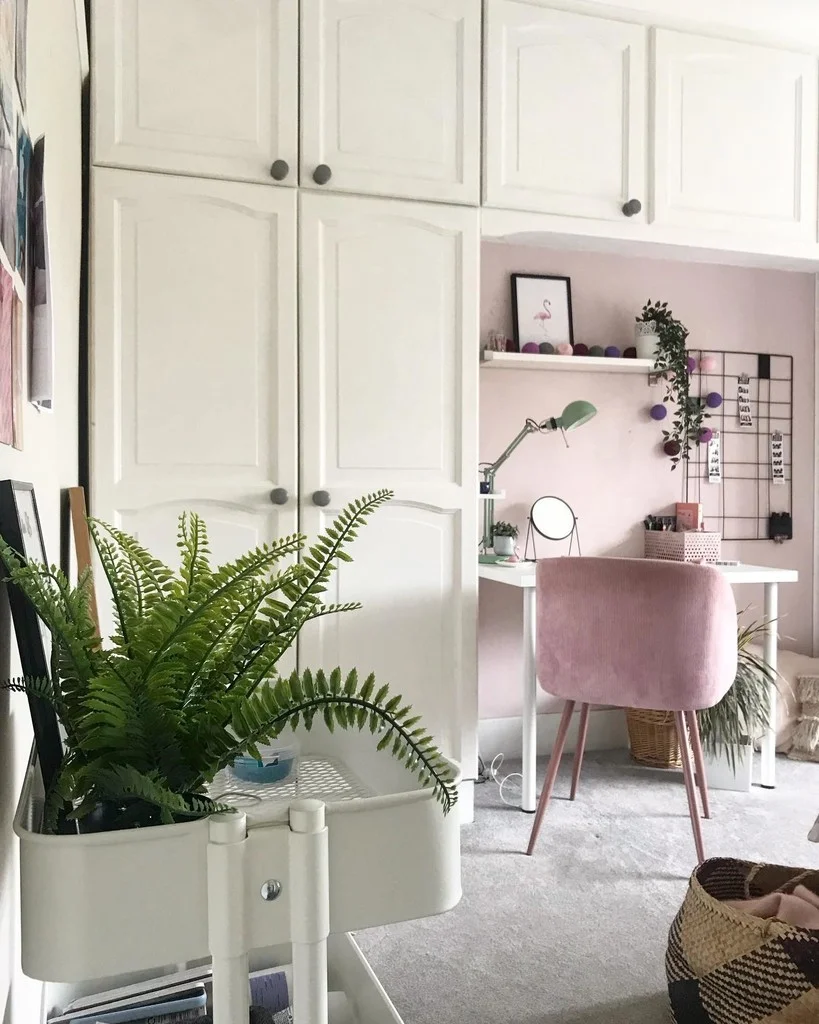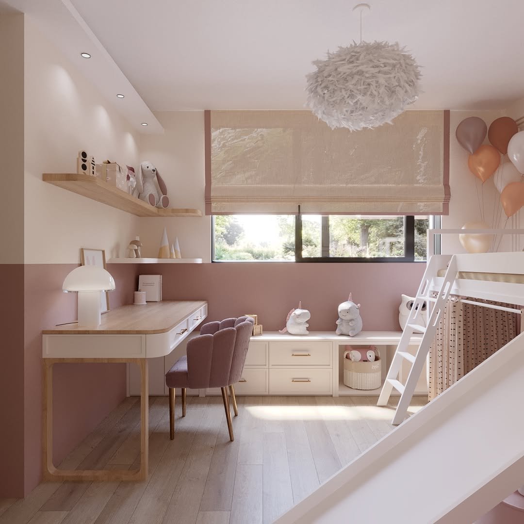 I just love how this blush pink color sits on the wall beside the window, even with that ample natural light it softens it in a pleasant way miking the room feel more inviting and gentle, it’s subtle enough so it doesn’t compete with other colors in the room, instead it highlights them making everything look cohesive.