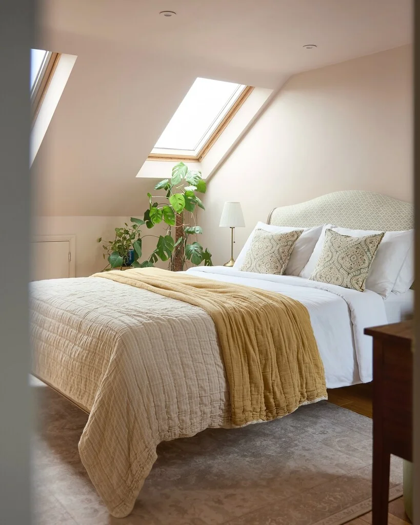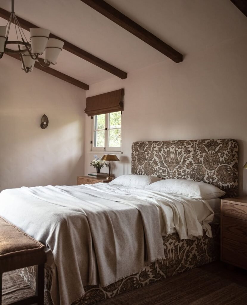 It’s quite clear that the off white compliments wood amazingly, it’s simple and airy, calm and inviting, even though that headboard fabric adds depth to the room, the paint made it stand out even more.